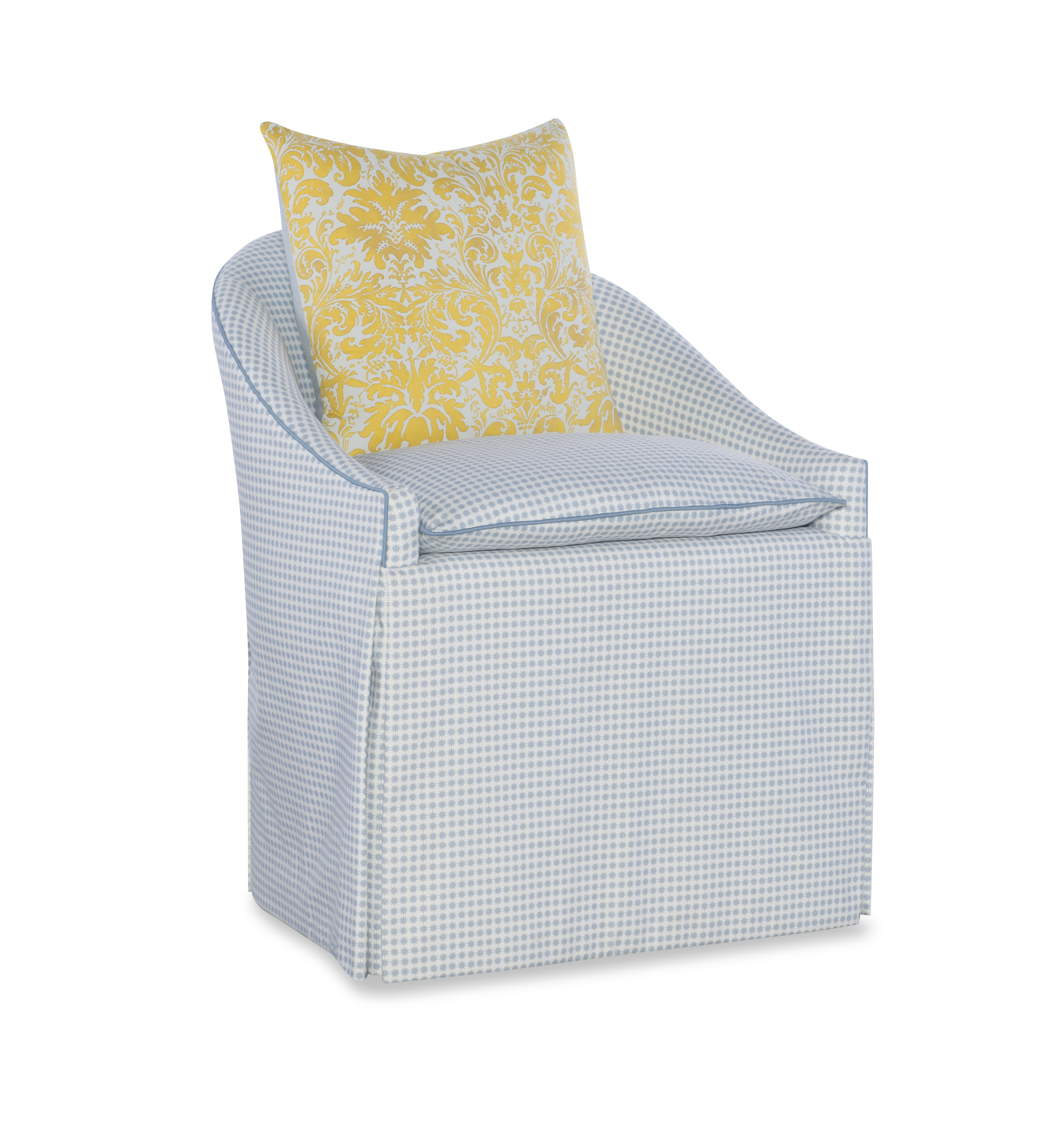 (View As Shown Info) Some color variation in photos of our furniture finishes and fabrics is possible due to the lighting and different color resolution on computer monitors. 1337 - Mame Chair W: 25 in D: 24.50 in H: 31 in Add Item to Wishlist Product Details Back Type Tight Seat Type Loose Certifications Notes Standard Weltless-Plain Seam on Cushion. Standard Topstitch on In-Arms/In-Back and Standard Micro Welt on Front & Top of Out-Arms/Out-Back. Dimensions Fabrics Fabric Search Dealer Locator
