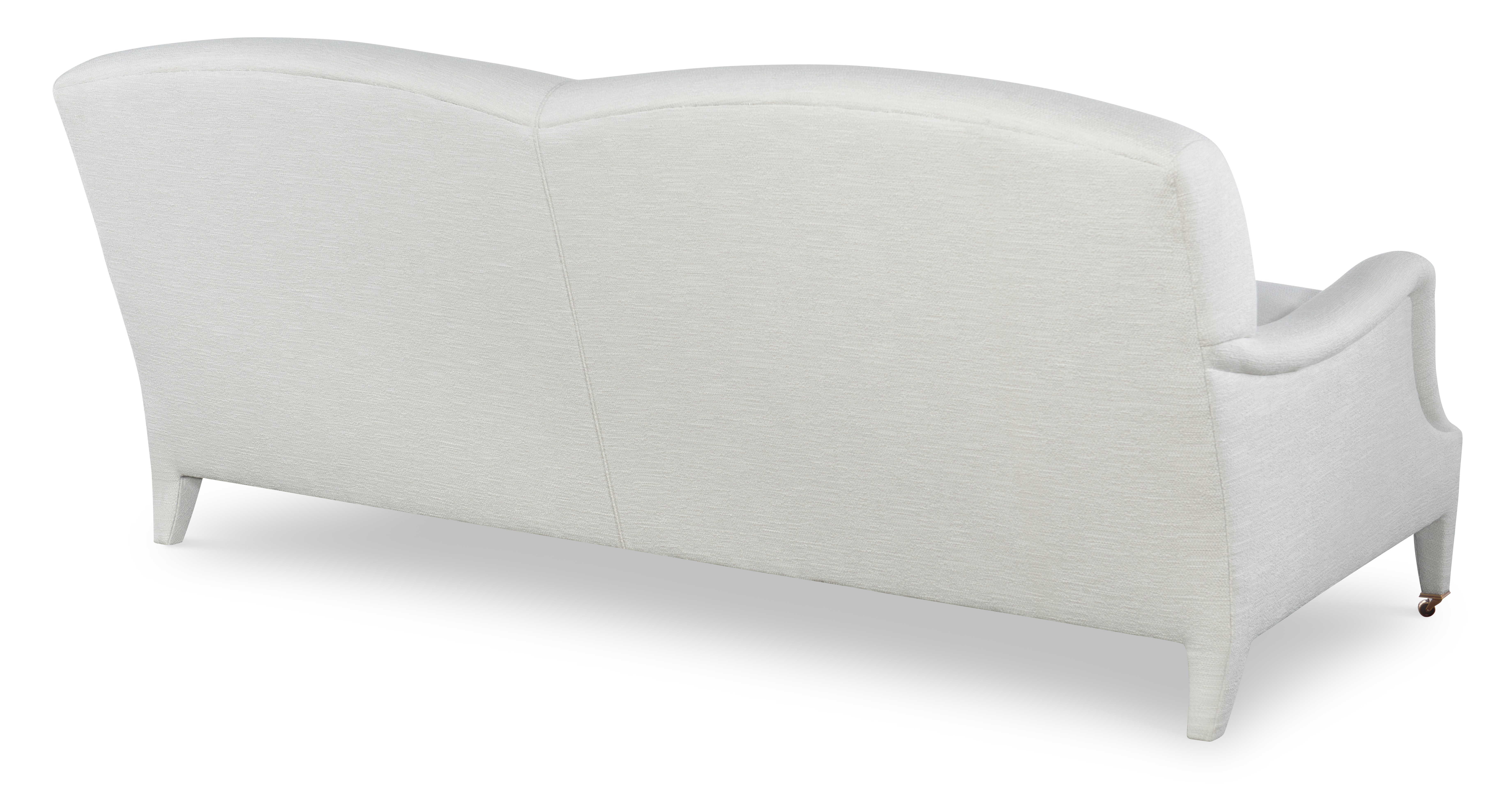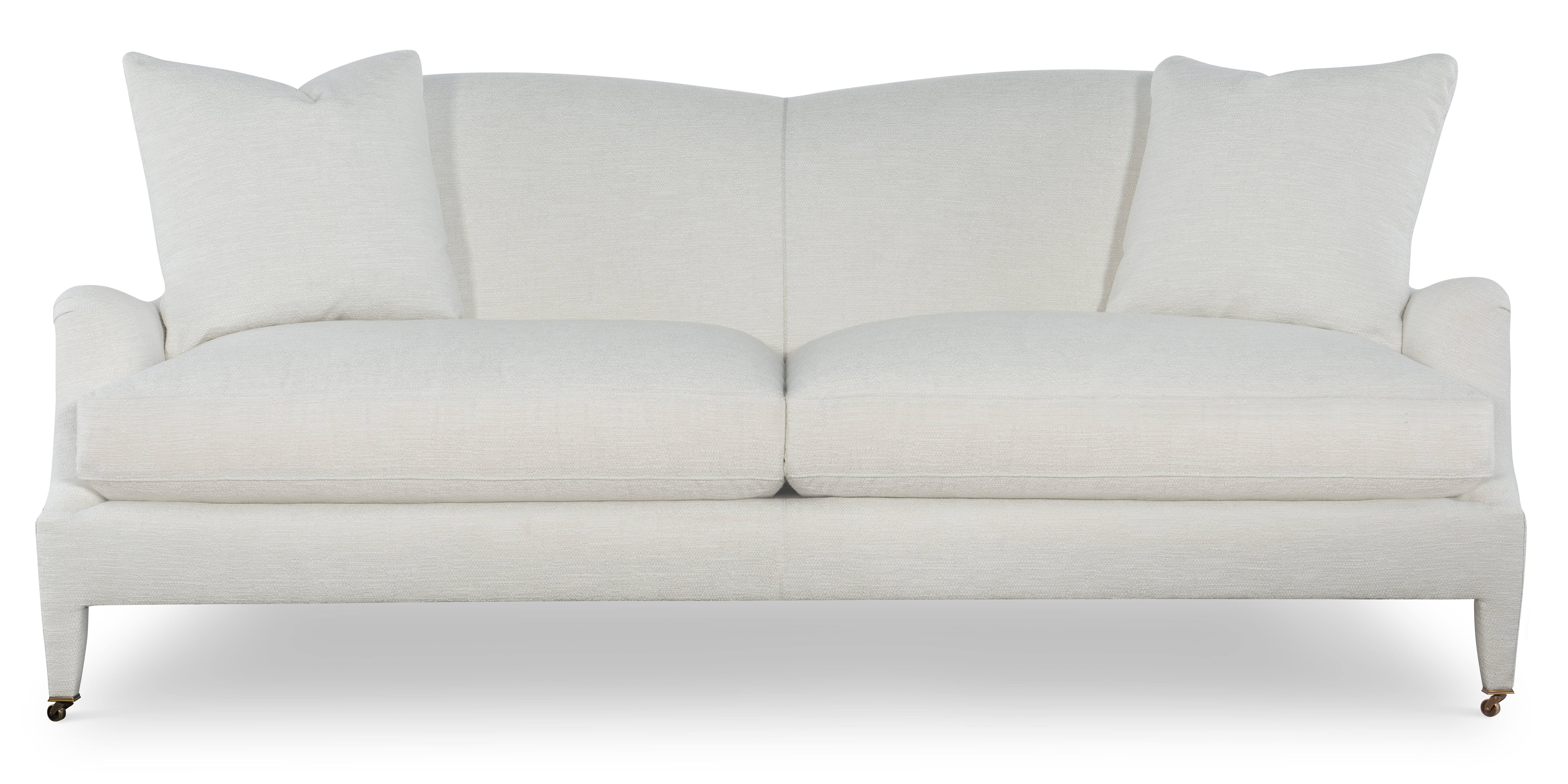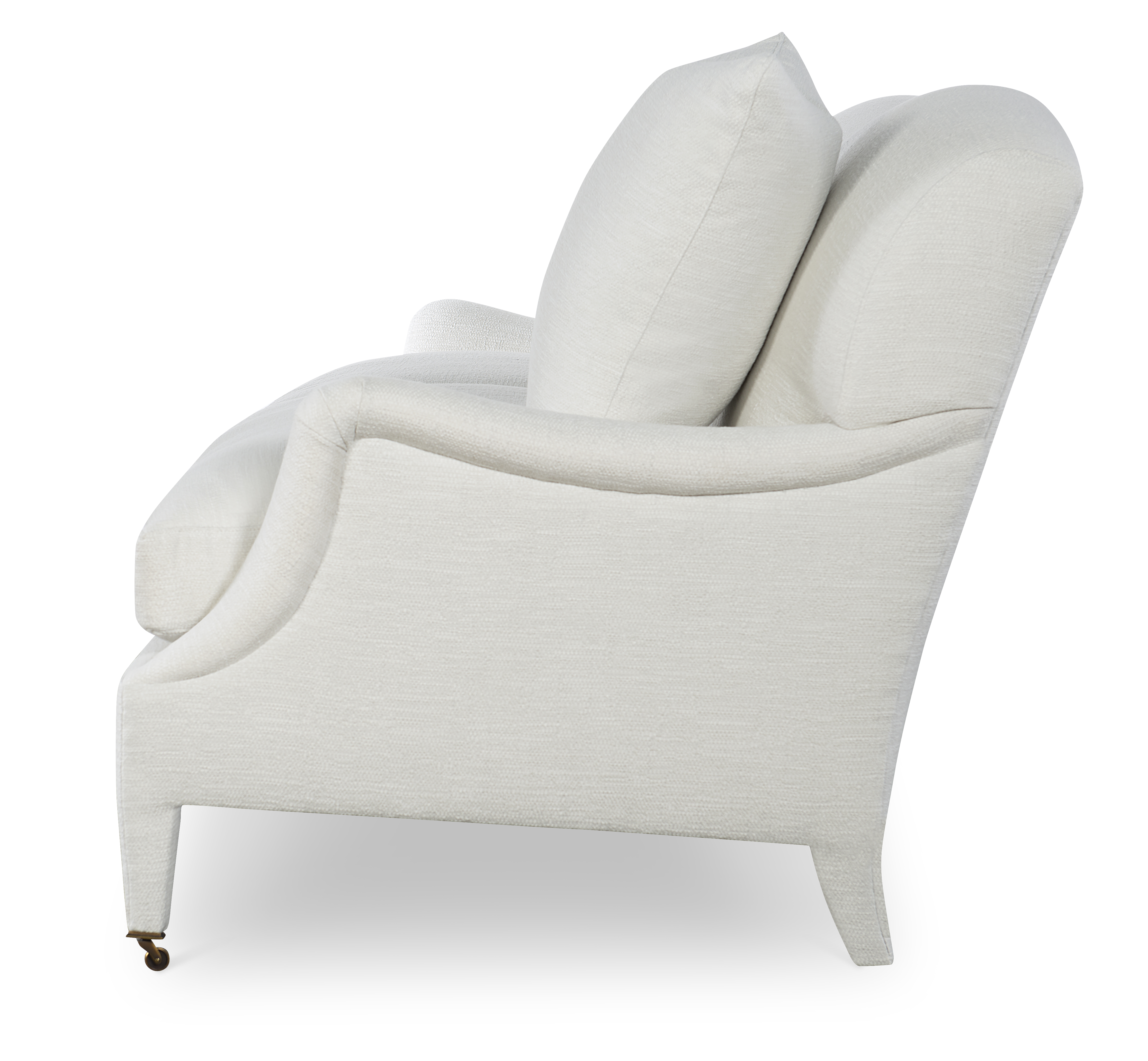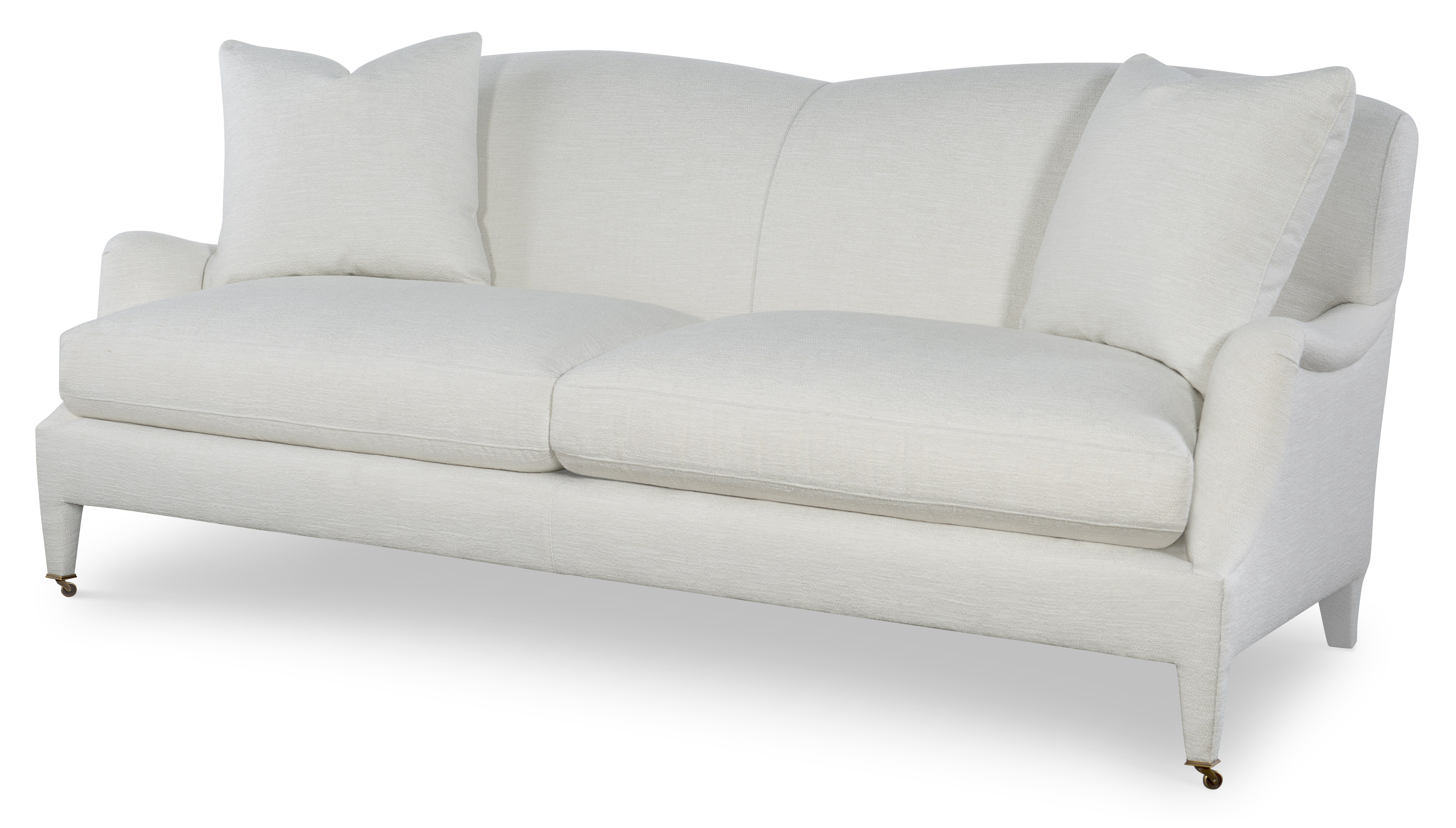 The silhouette of the frame was inspired by an English Antique. We modified the shape of the traditional English arm and upholstered the legs to give the piece a more modern sensibility. Standard with Topstitch on Cushions and In-Back. No Welt. Standard Antique Brass Casters and OPT Satin Nickel Casters