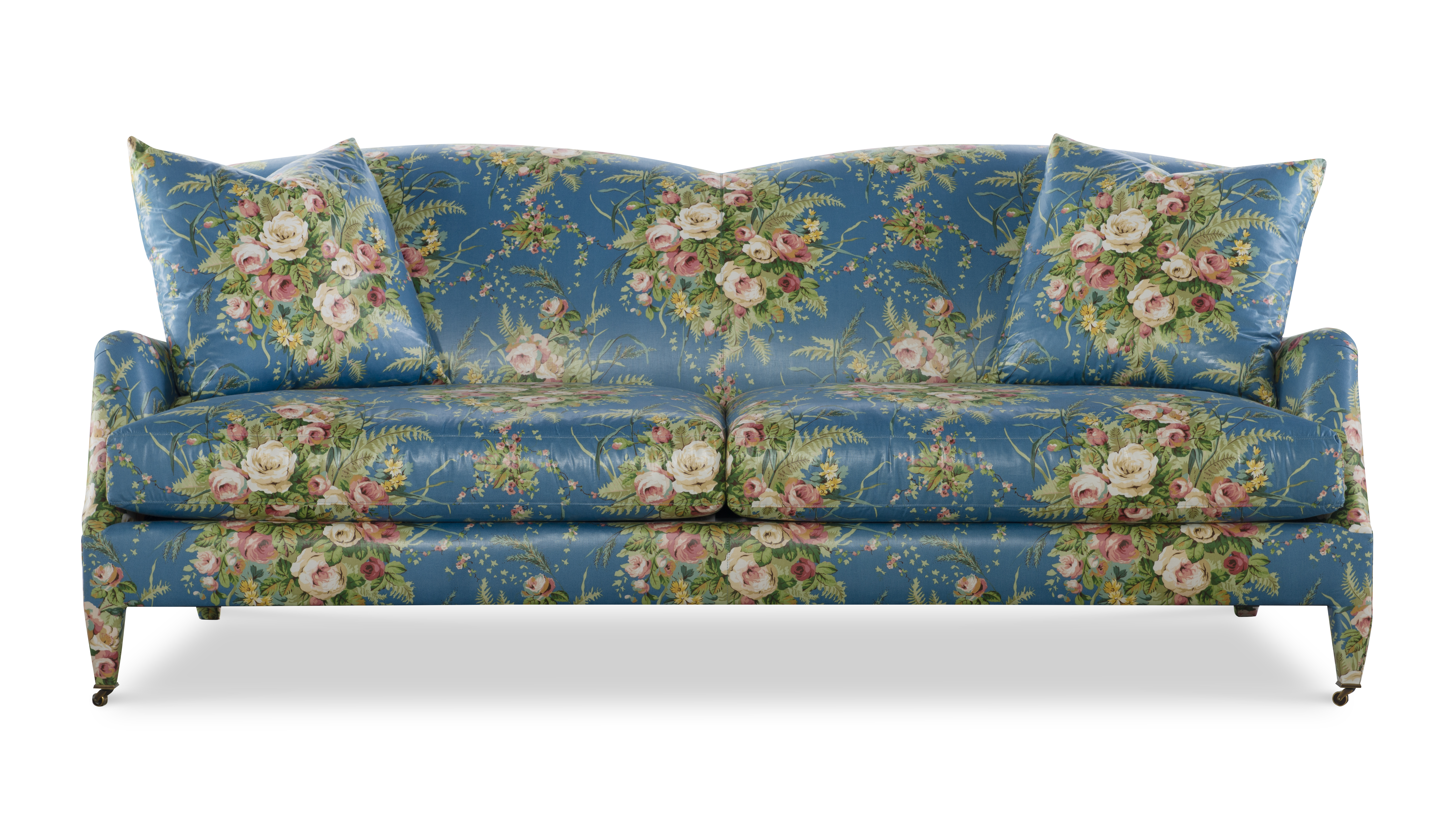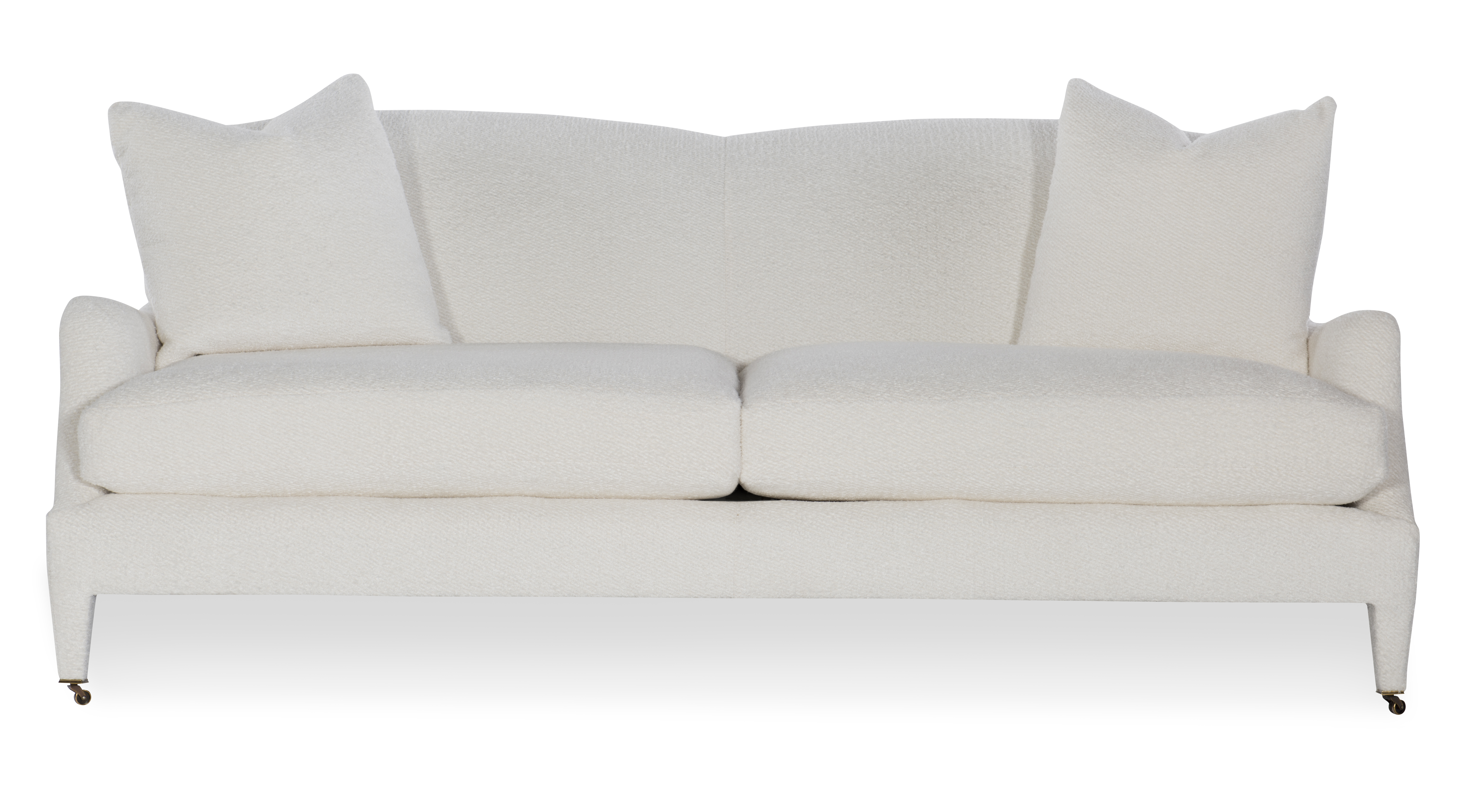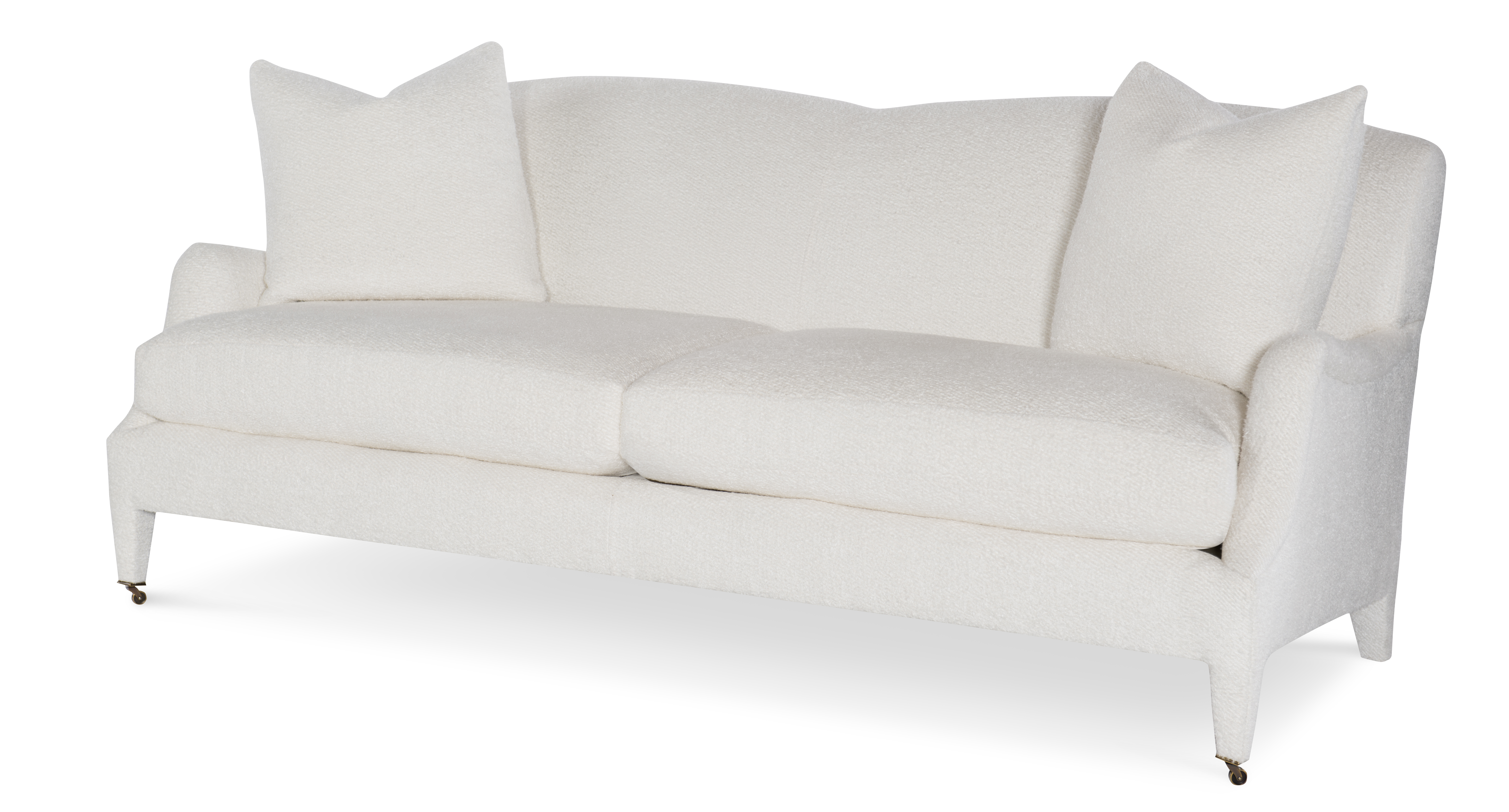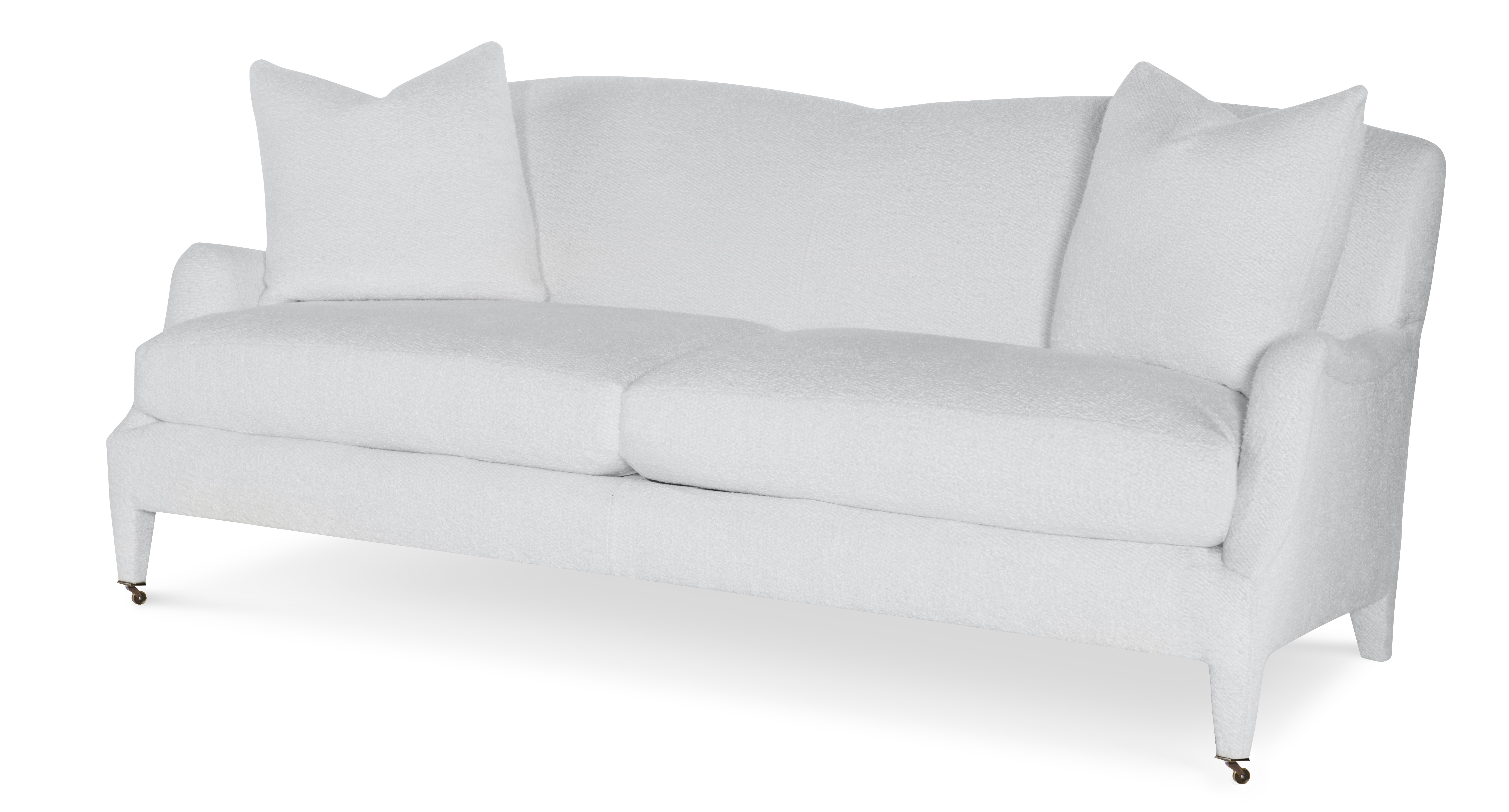 The silhouette of the frame was inspired by an English Antique. We modified the shape of the traditional English arm and upholstered the legs to give the piece a more modern sensibility. Standard with Topstitch on Cushions and In-Back. No Welt. Standard Antique Brass Casters and OPT Satin Nickel Casters