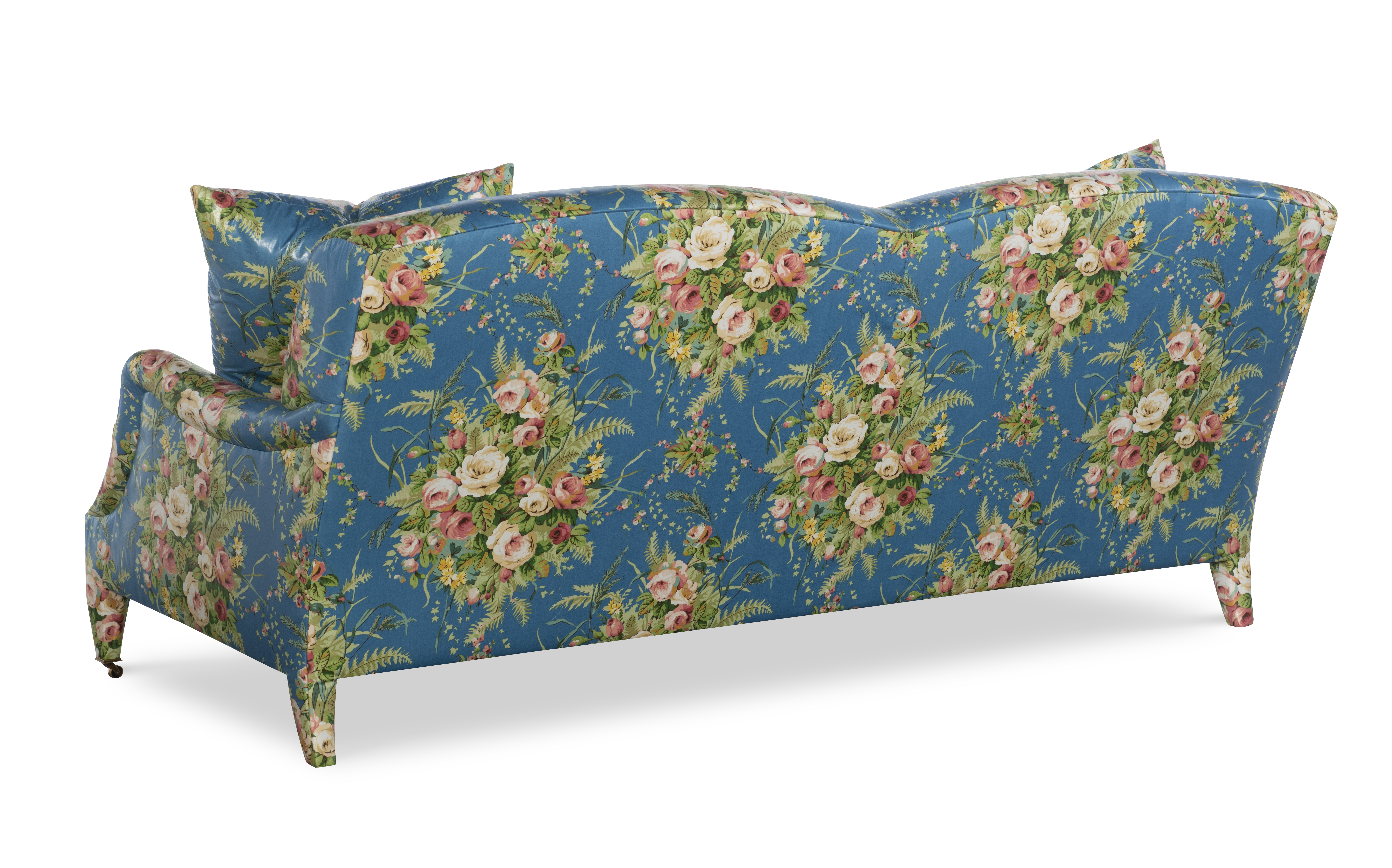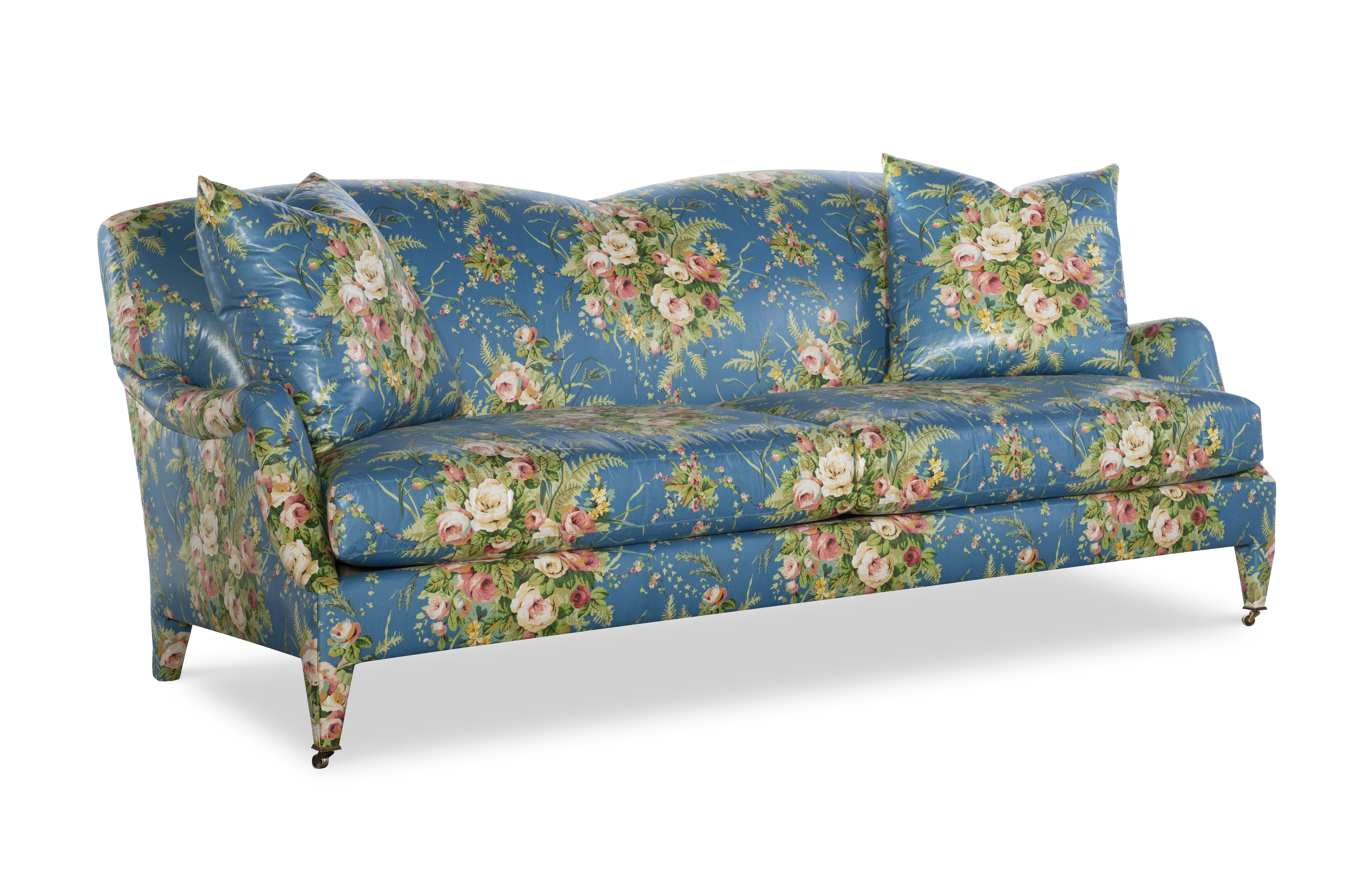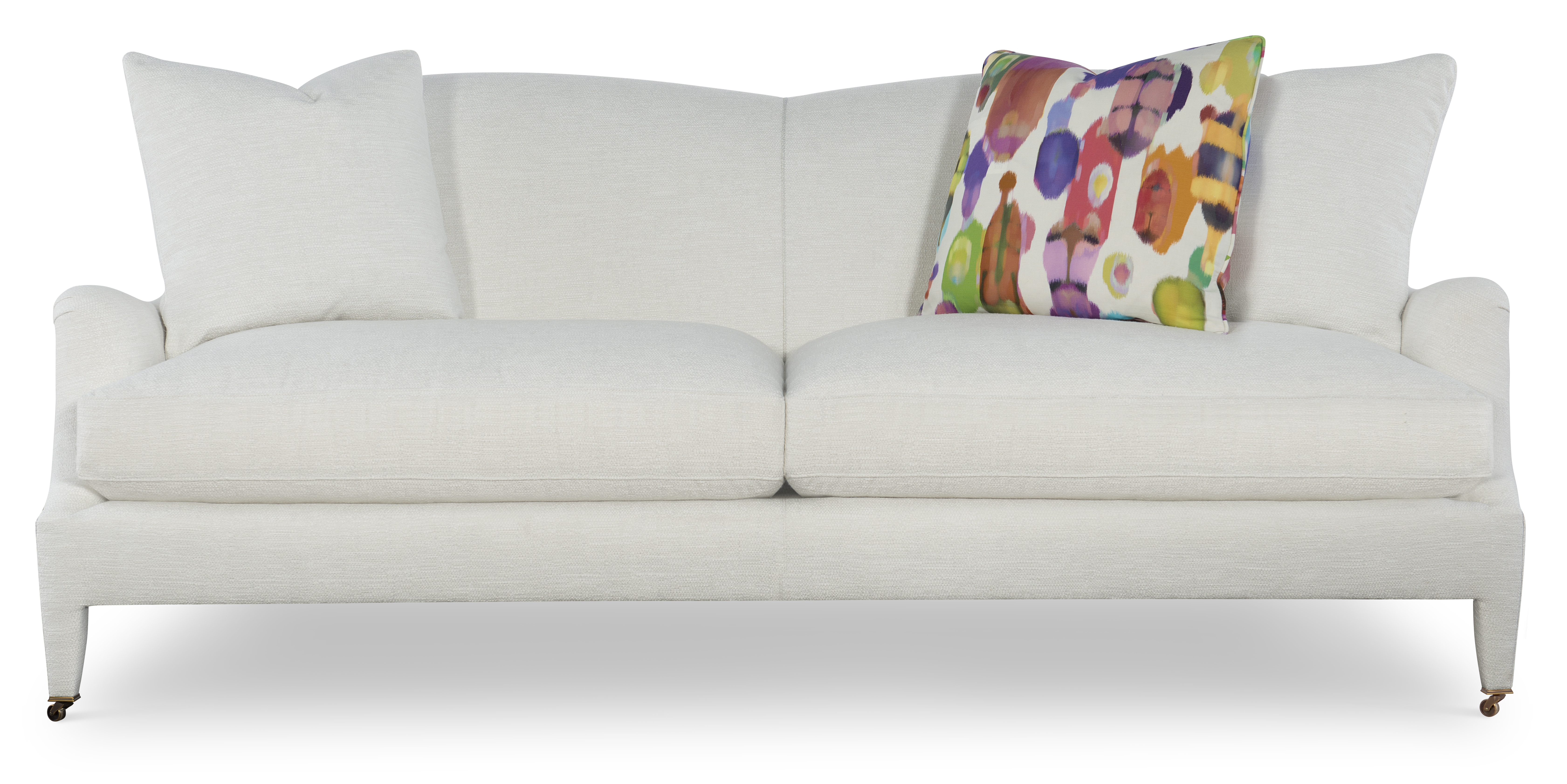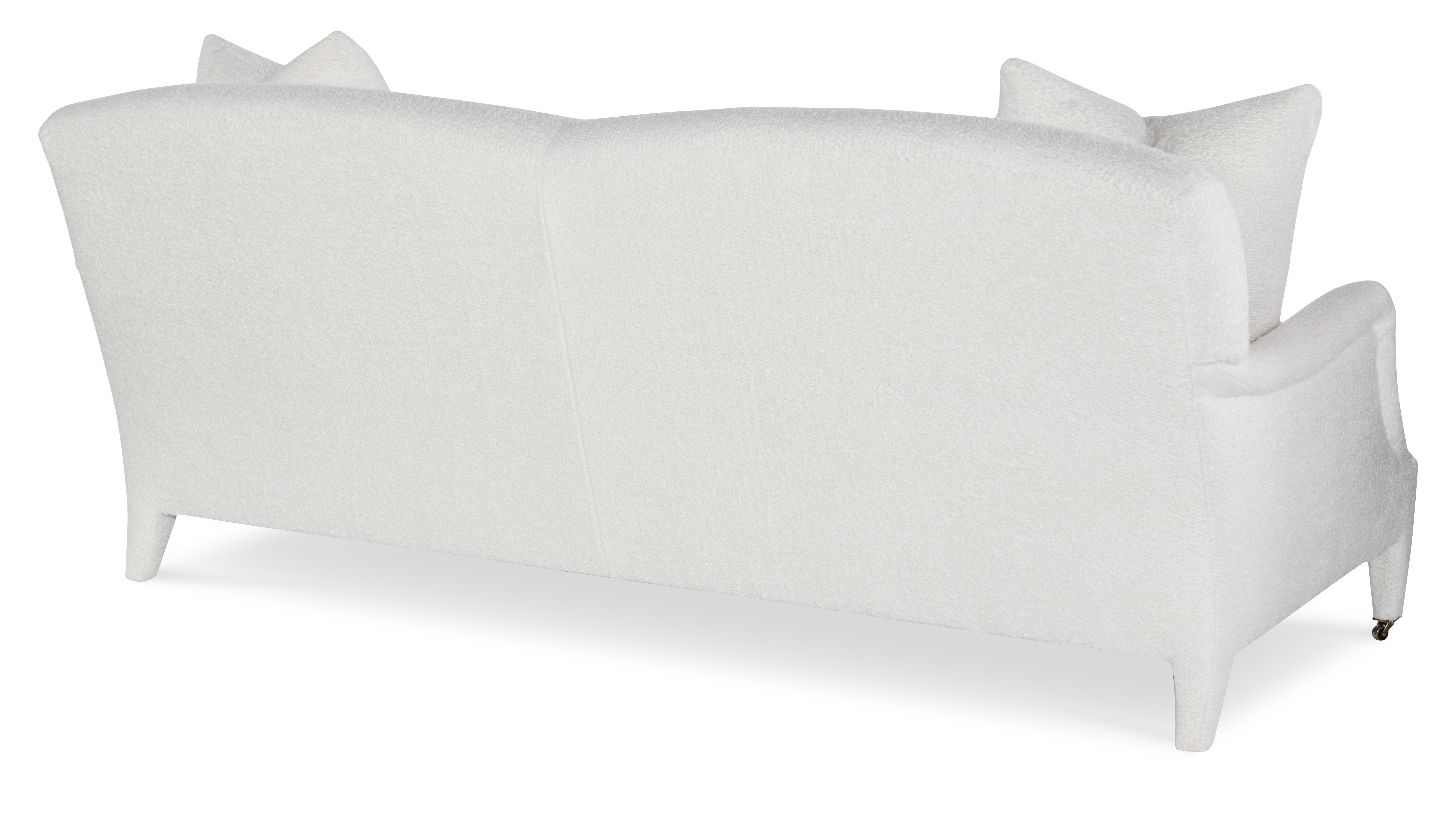 The silhouette of the frame was inspired by an English Antique. We modified the shape of the traditional English arm and upholstered the legs to give the piece a more modern sensibility. Standard with Topstitch on Cushions and In-Back. No Welt. Standard Antique Brass Casters and OPT Satin Nickel Casters