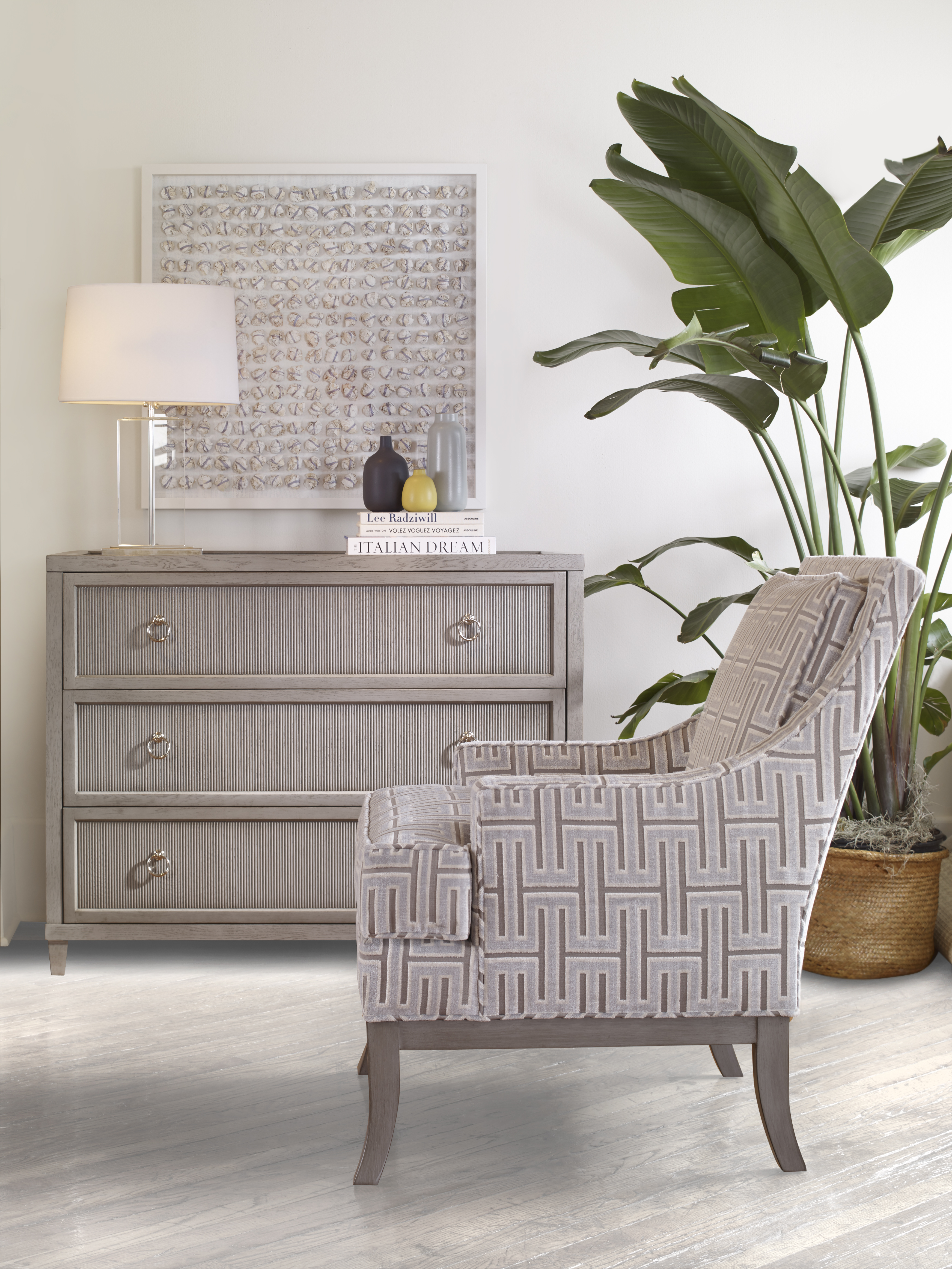 (View As Shown Info) Some color variation in photos of our furniture finishes and fabrics is possible due to the lighting and different color resolution on computer monitors. HH19-710 - Luca Chest Highland House Wood W: 46.25 in D: 22 in H: 36 in Add Item to Wishlist Product Details Material Oak Veneers, Oak Solids Notes Standard Antique Brass Hardware and OPT Polished Nickel Hardware. Dimensions Finishes Finish List Dealer Locator