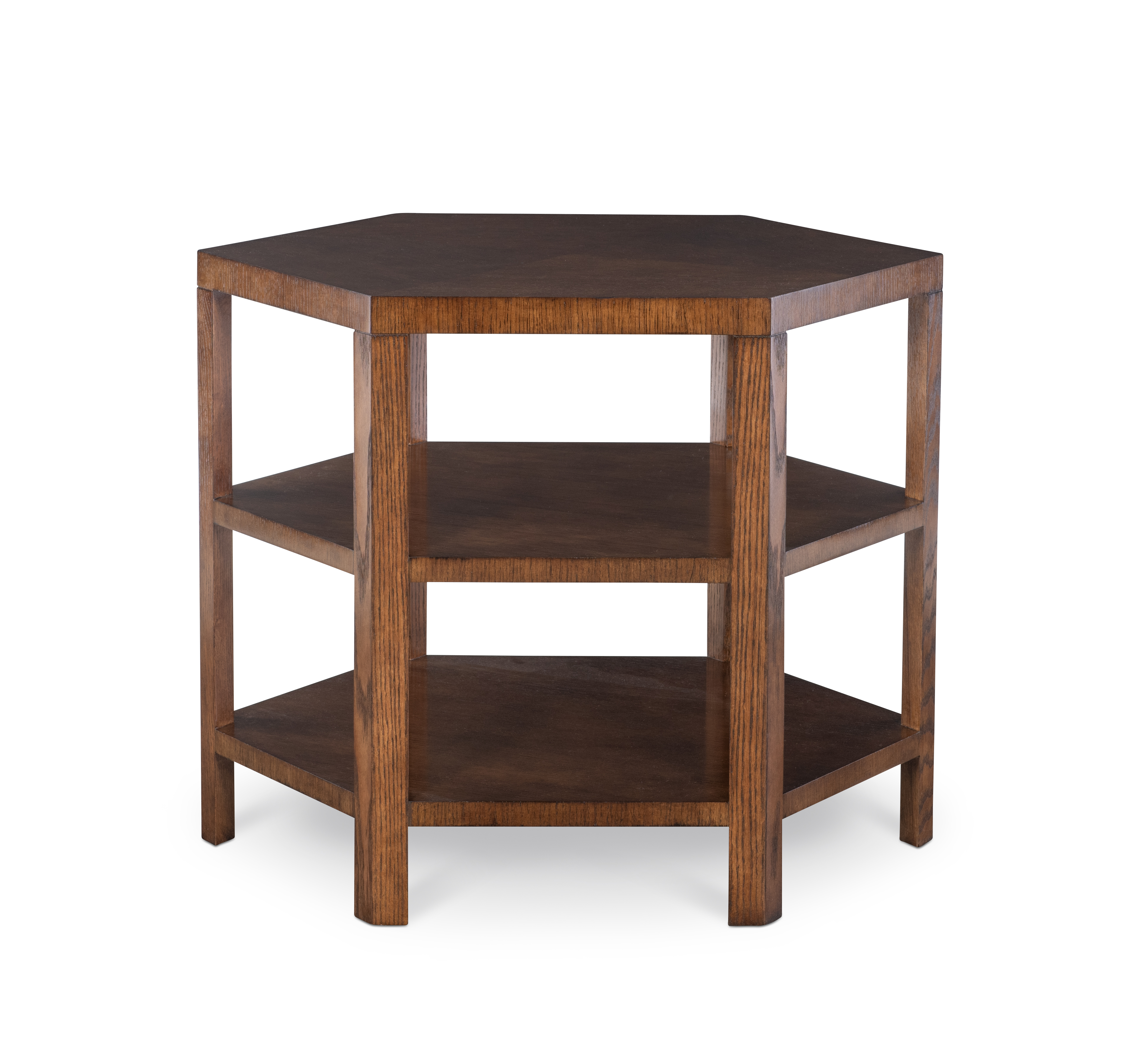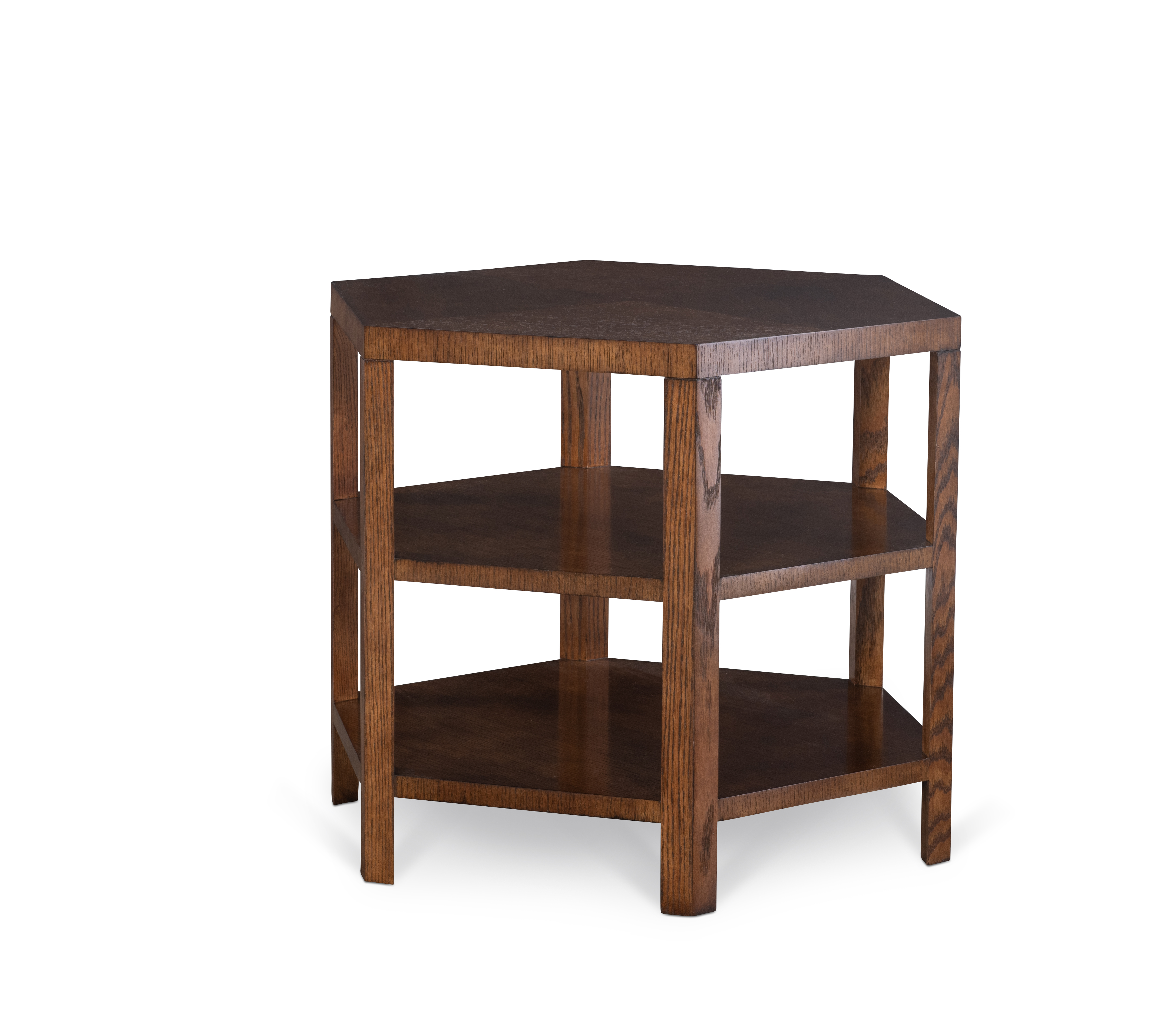 (View As Shown Info) Some color variation in photos of our furniture finishes and fabrics is possible due to the lighting and different color resolution on computer monitors. HH26-158 - Hex Side Table Highland House Wood W: 31 in D: 26.75 in H: 25 in Add Item to Wishlist Product Details Material Oak Veneers, Oak Solids Dimensions Finishes Finish List Dealer Locator