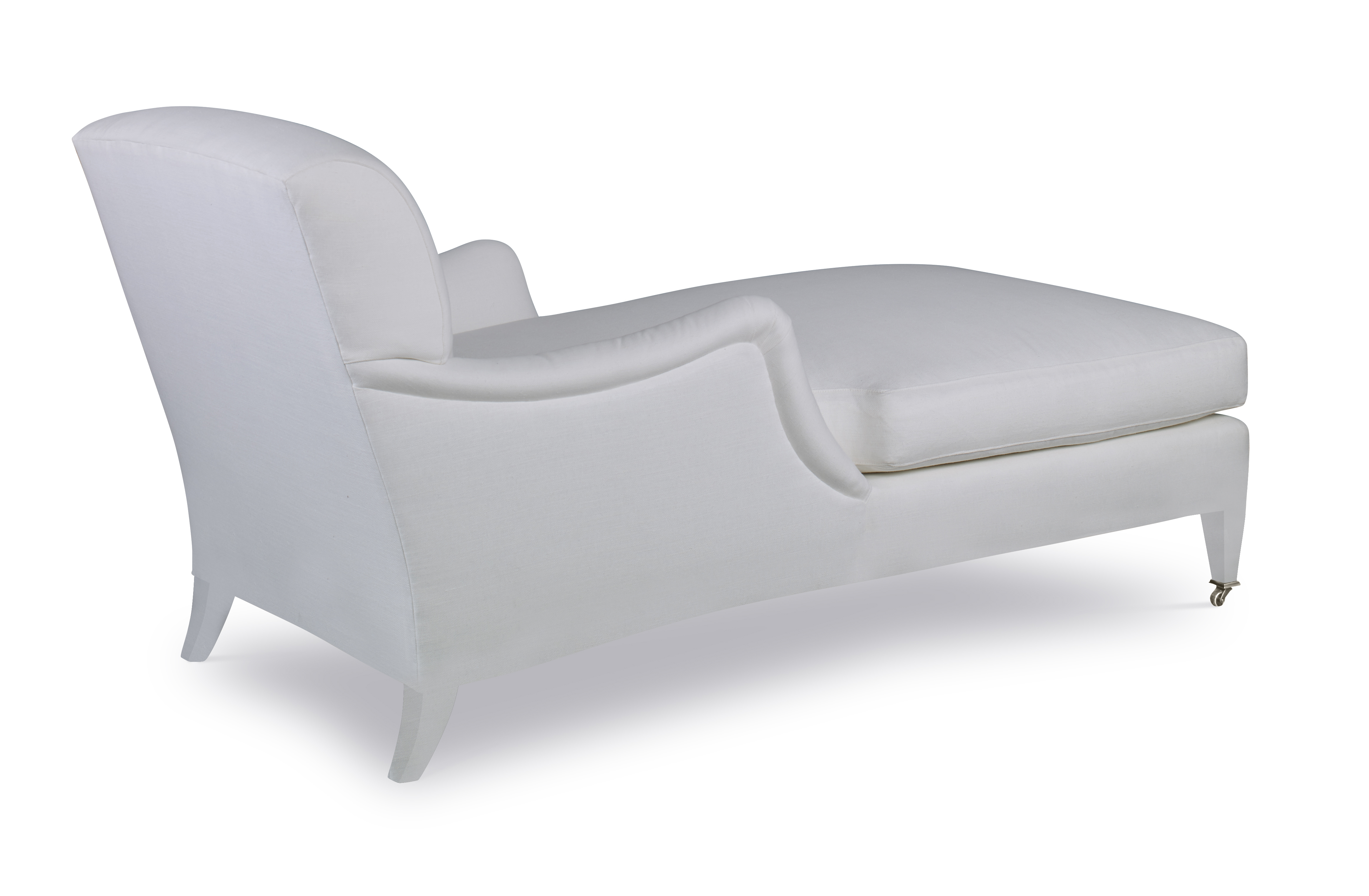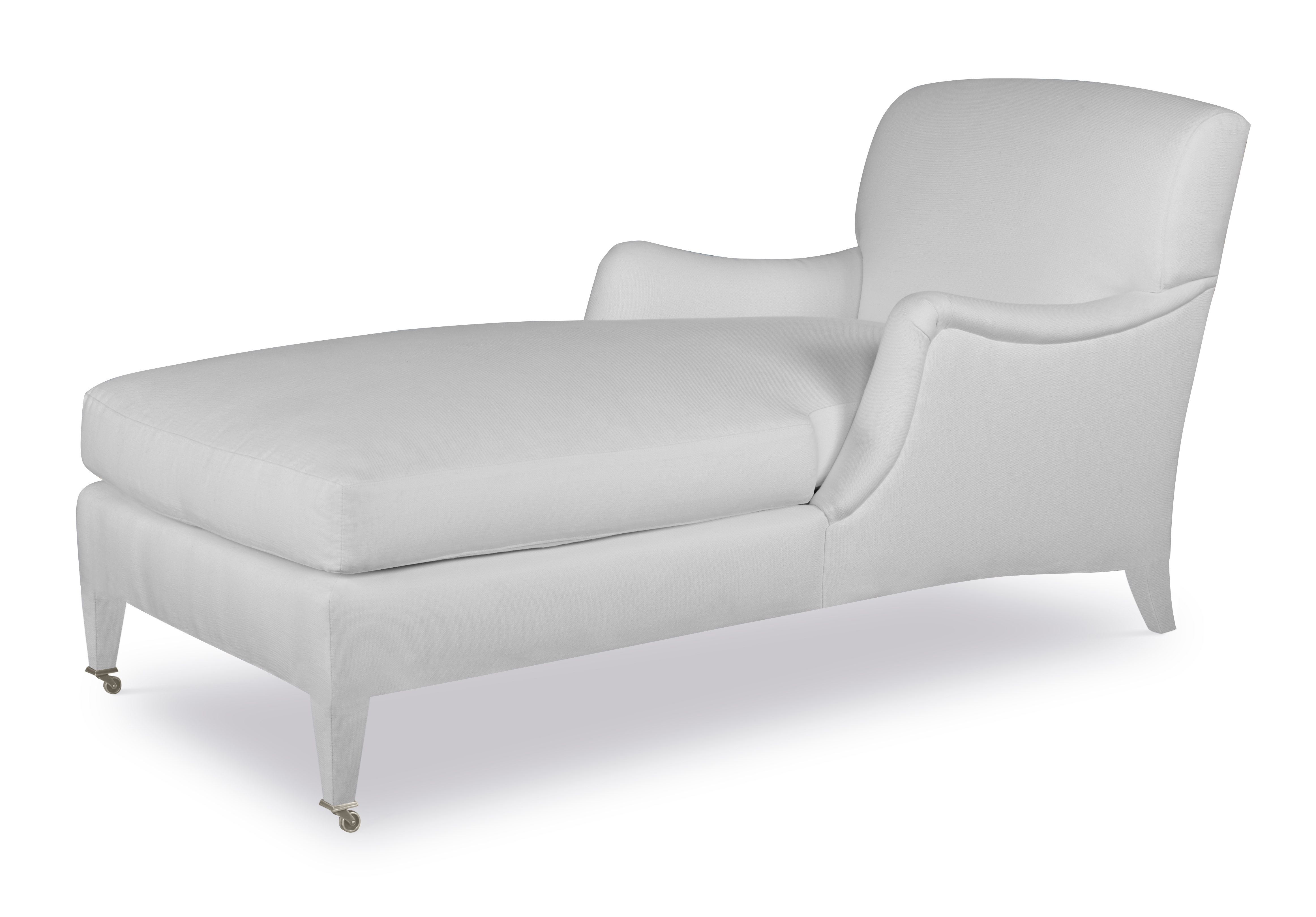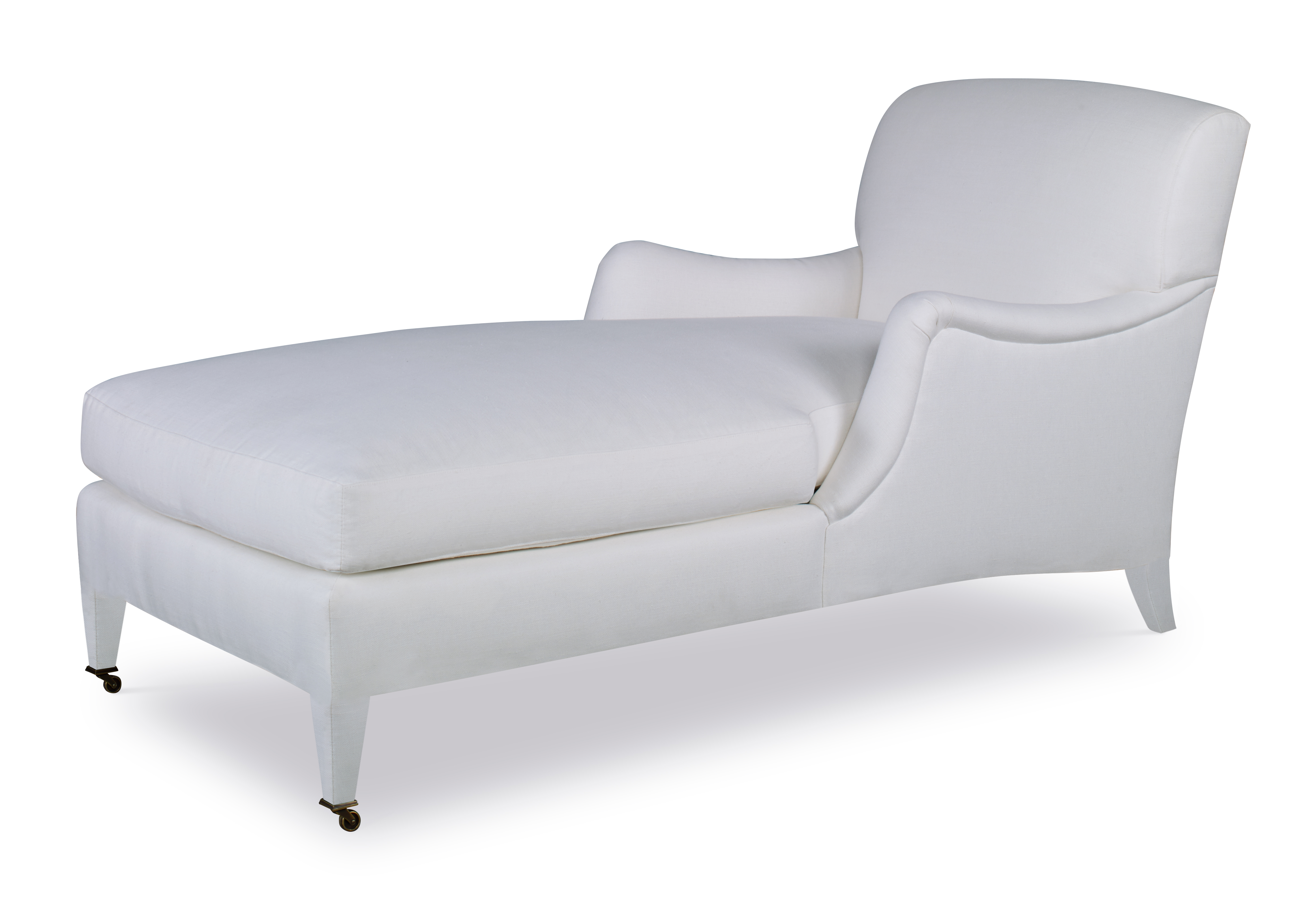 The silhouette of the frame was inspired by an English Antique. We modified the shape of the traditional English arm and upholstered the legs to give the piece a more modern sensibility. Standard with Topstitch on Cushions and In-Back. No Welt. Standard Antique Brass Casters and OPT Satin Nickel Casters