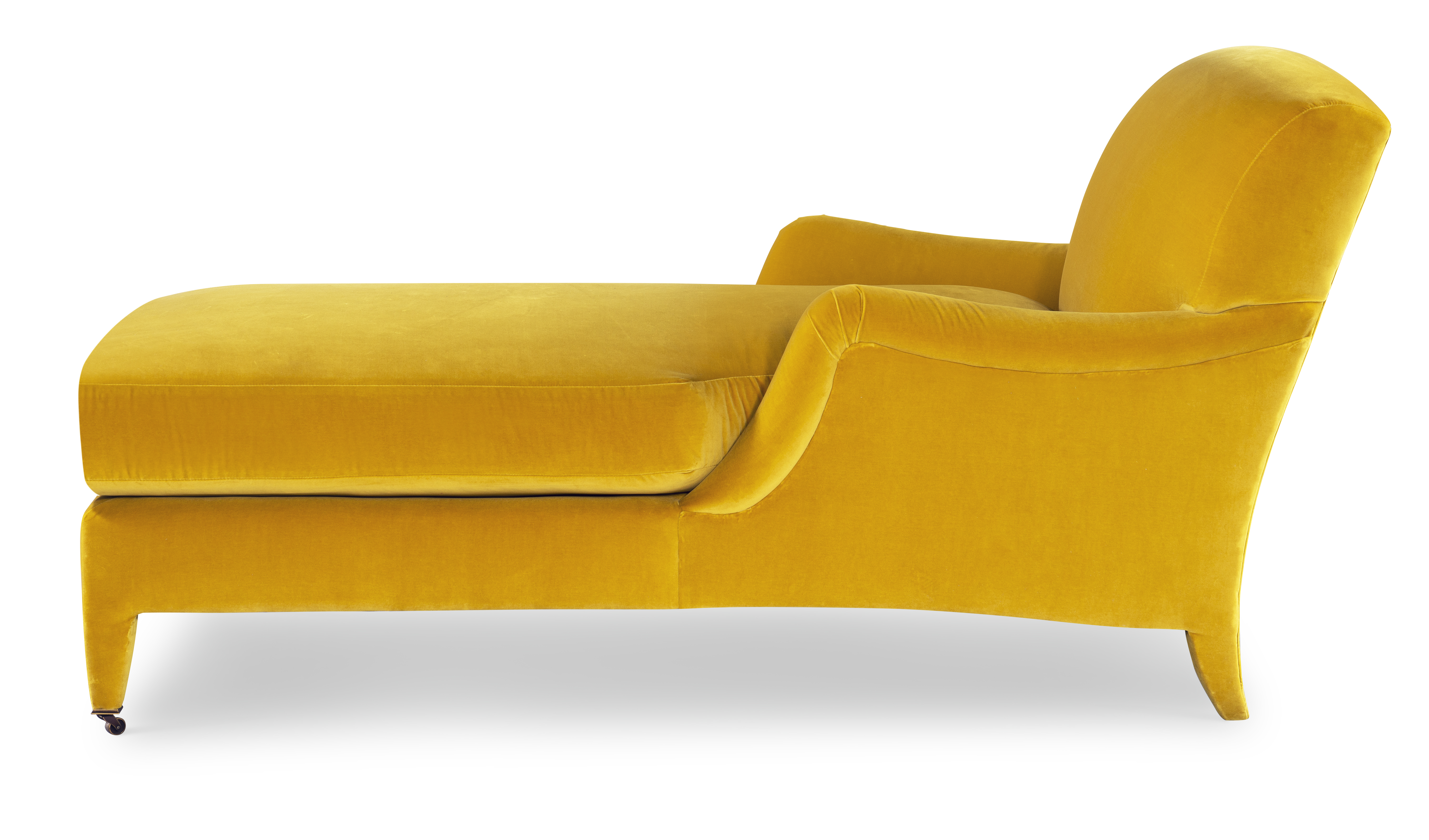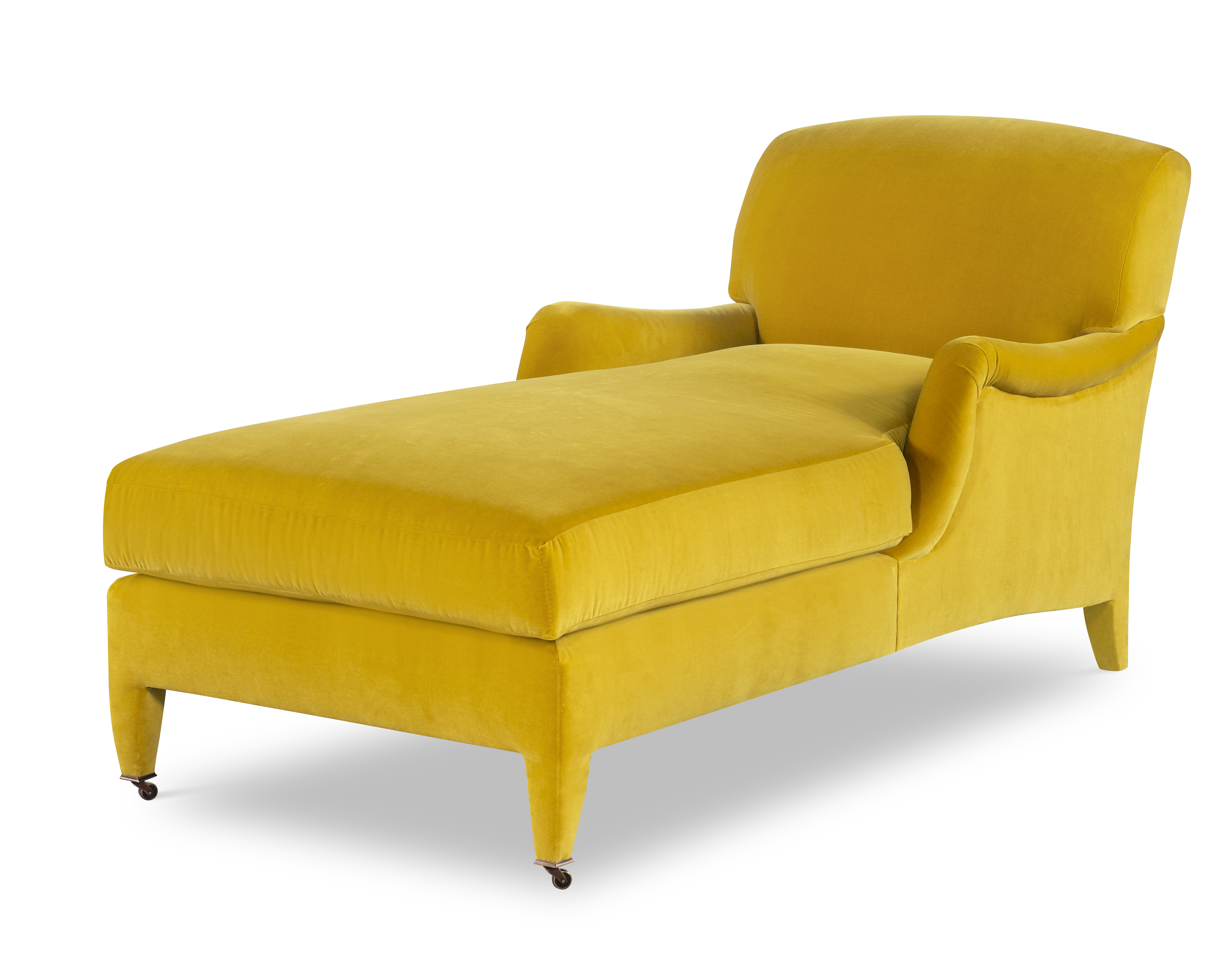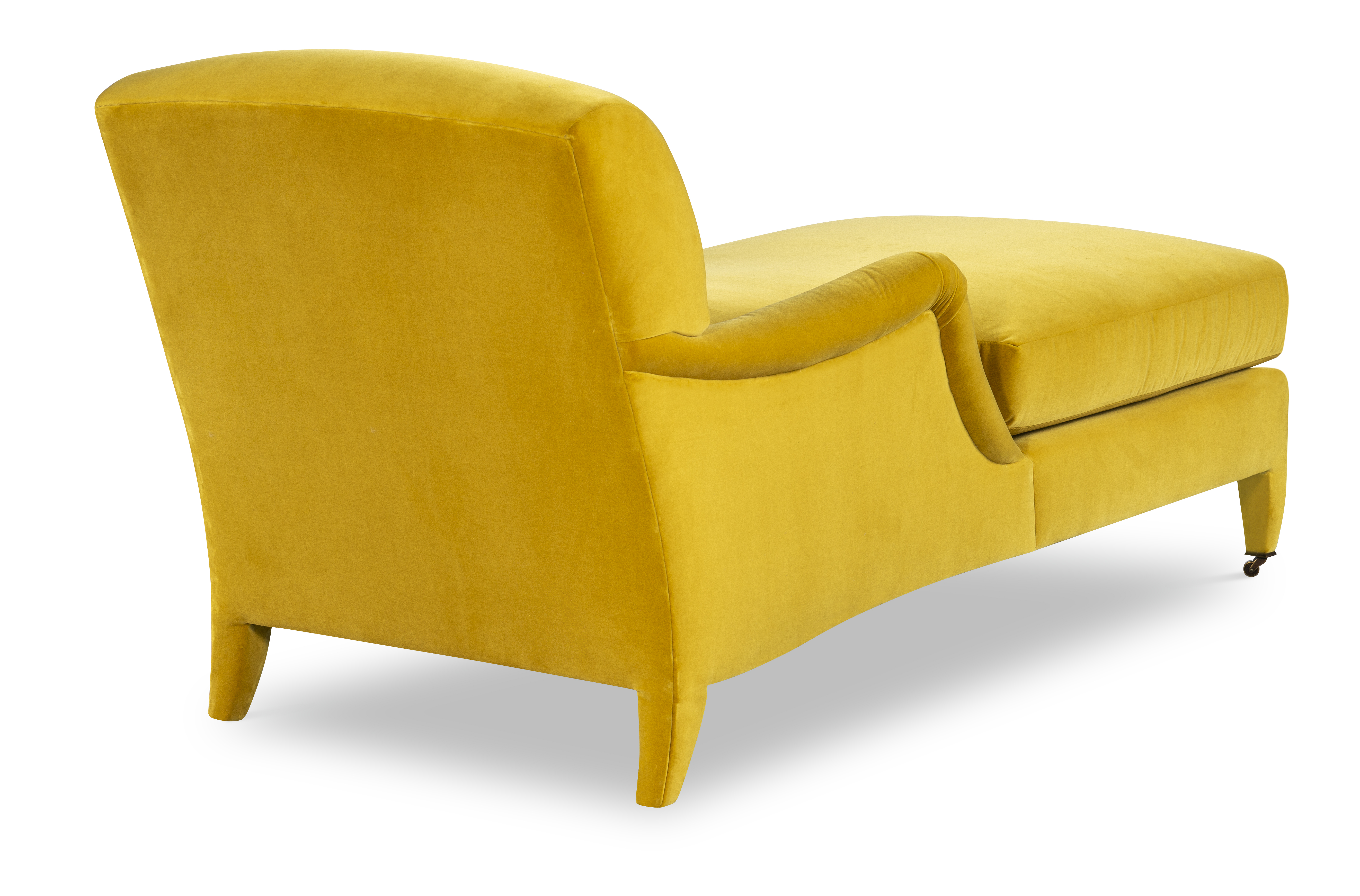 The silhouette of the frame was inspired by an English Antique. We modified the shape of the traditional English arm and upholstered the legs to give the piece a more modern sensibility. Standard with Topstitch on Cushions and In-Back. No Welt. Standard Antique Brass Casters and OPT Satin Nickel Casters