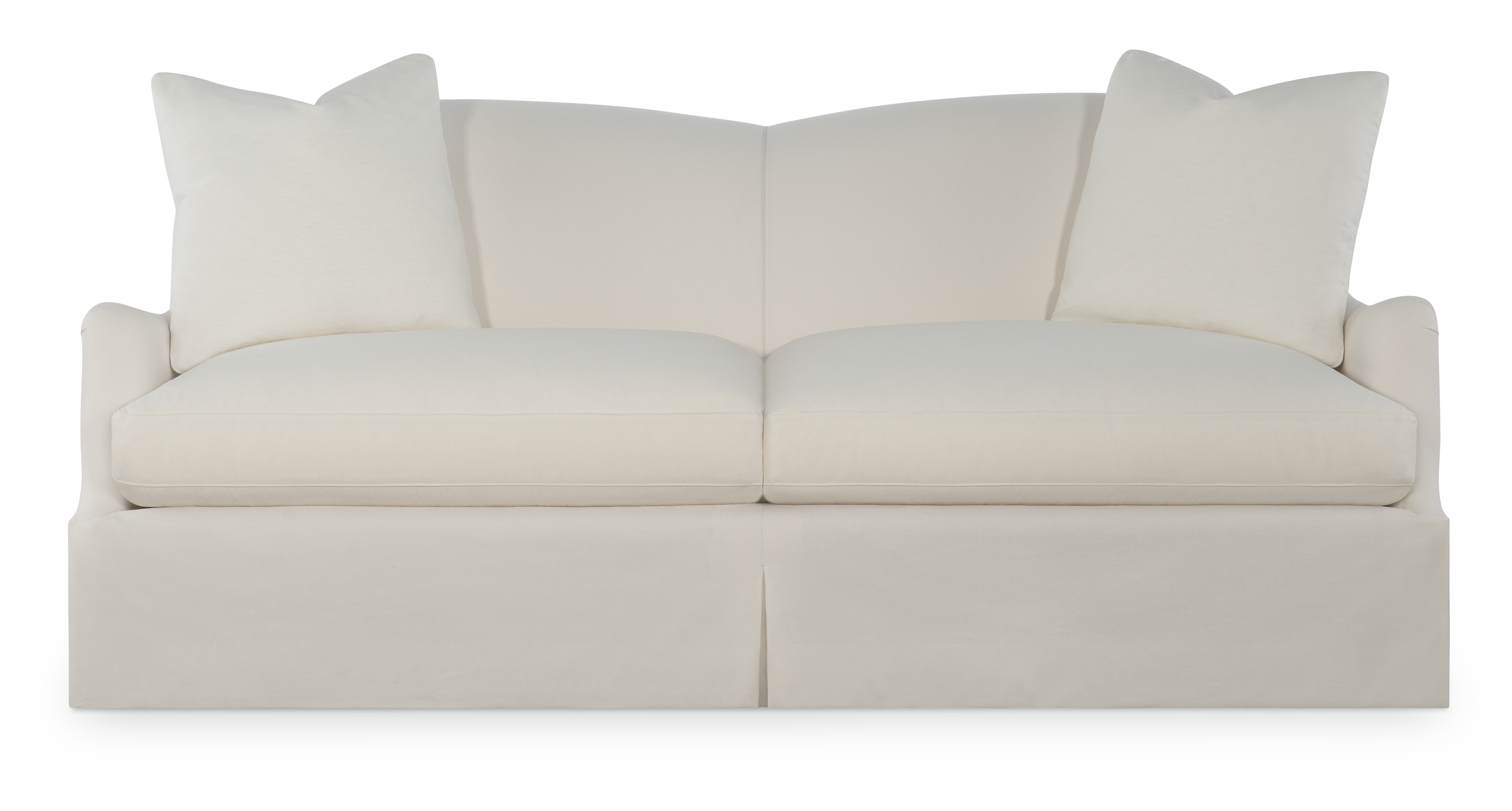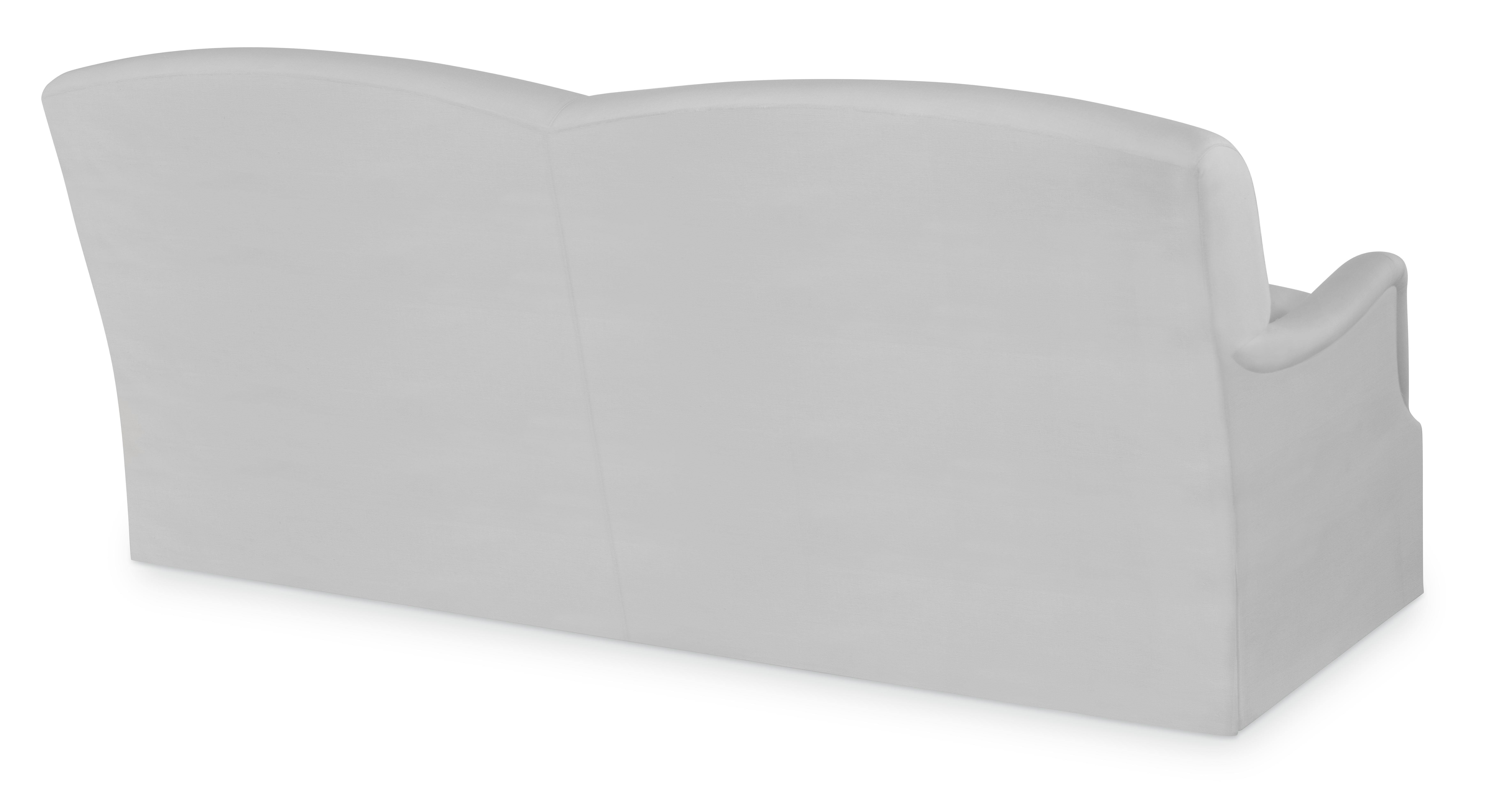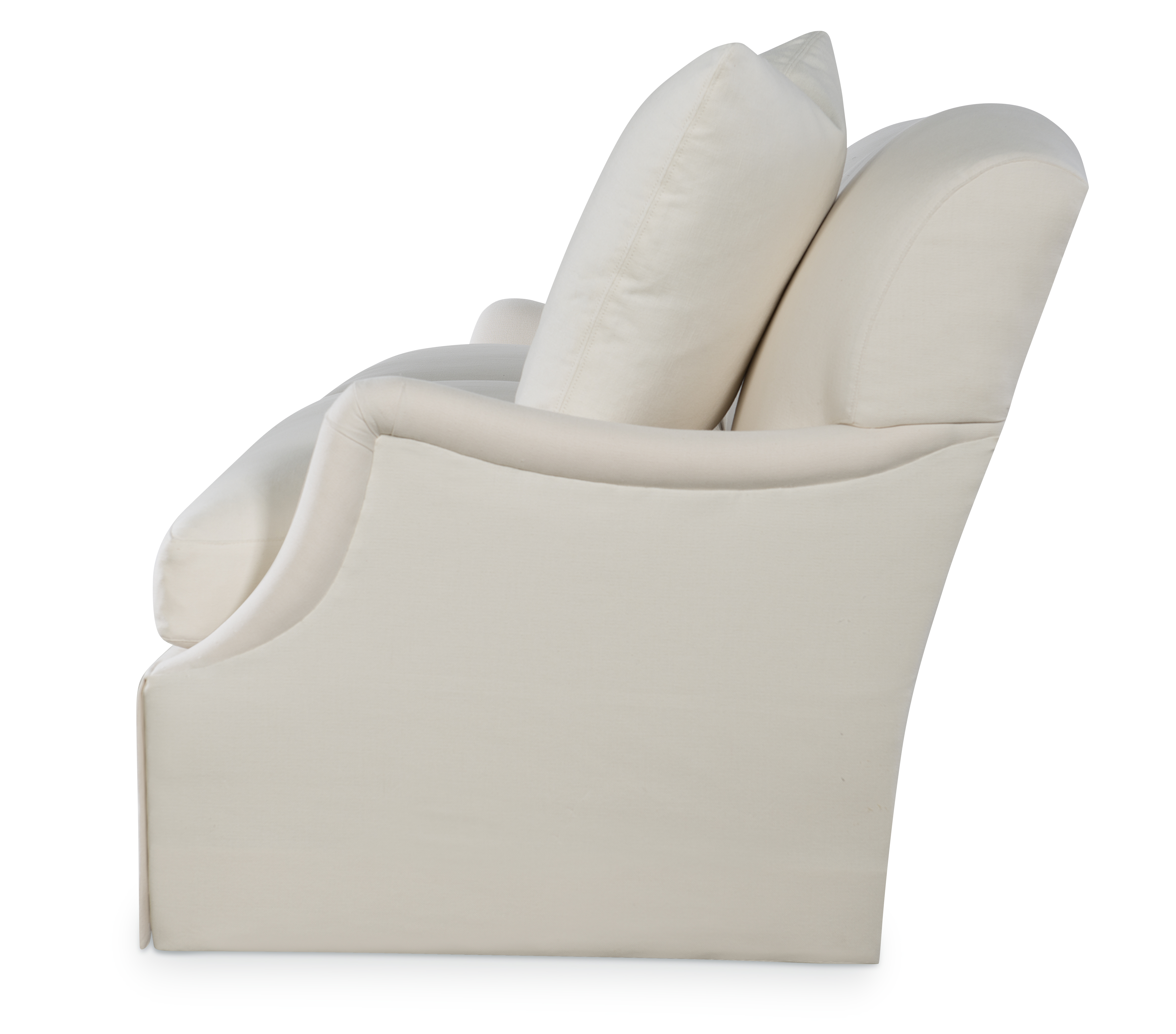 The silhouette of the frame was inspired by an English Antique. We modified the shape of the traditional English arm and added a graceful waterfall skirt to give the piece a more modern sensibility. Standard with Topstitch on Cushions and In-Back. No Welt.