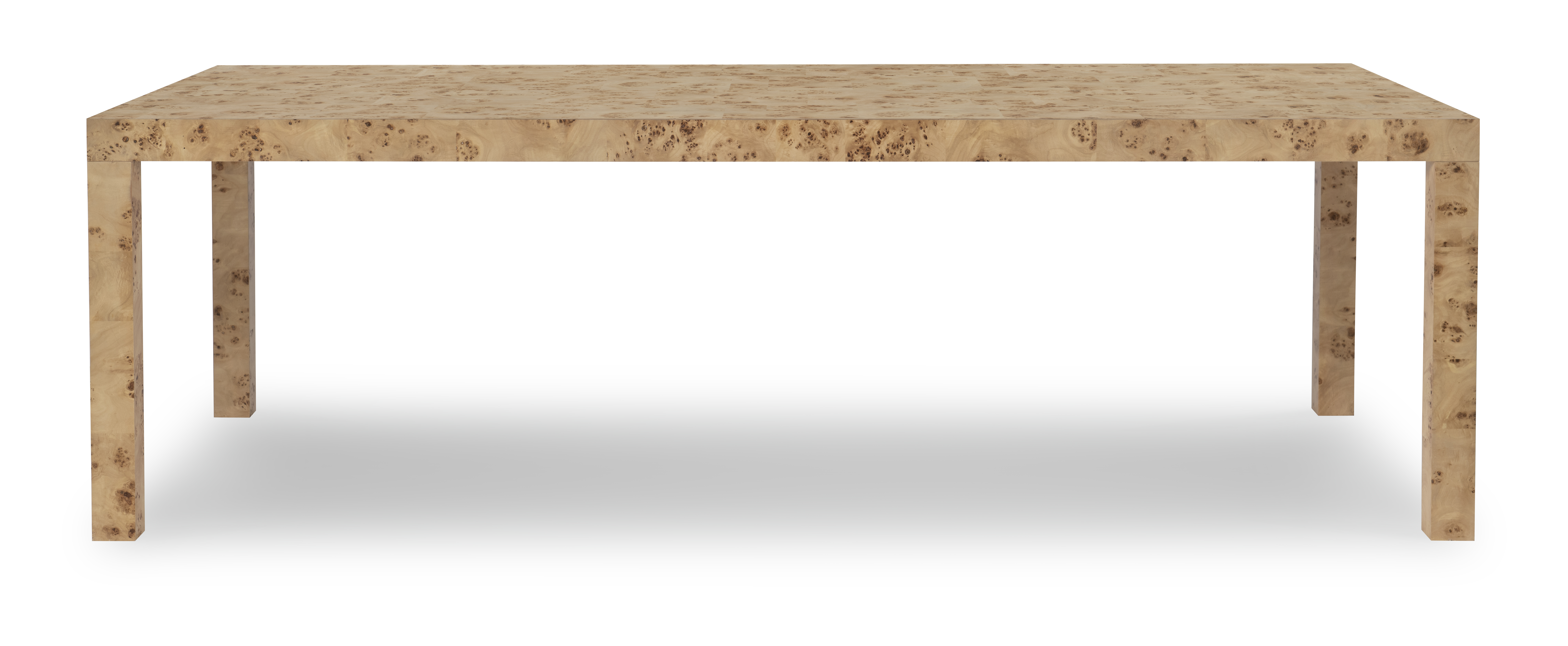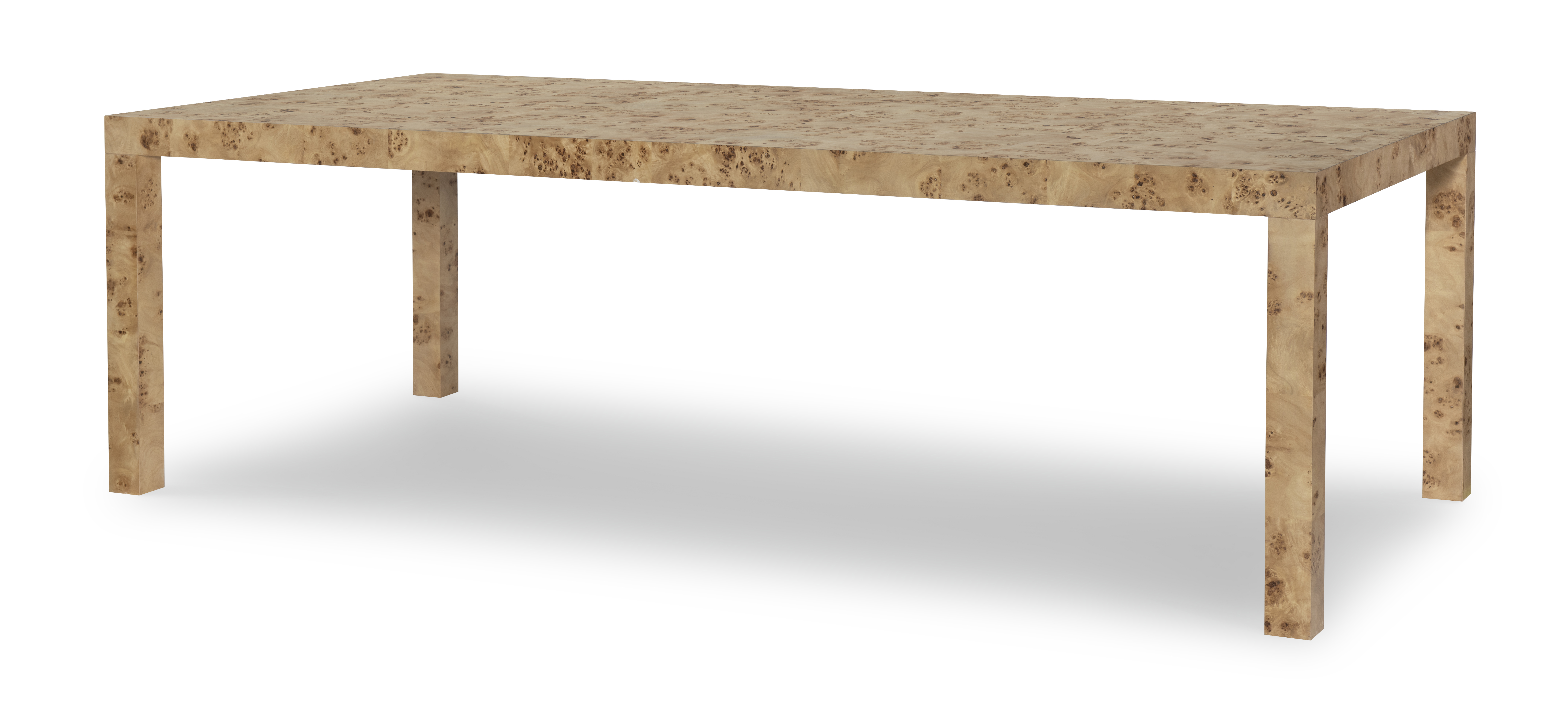 (View As Shown Info) Some color variation in photos of our furniture finishes and fabrics is possible due to the lighting and different color resolution on computer monitors. HH26-116 - Parsons Burl Dining Table Highland House Wood W: 96 in D: 45 in H: 30 in Add Item to Wishlist Product Details Material Mappa Burl Veneers Dimensions Finishes Finish List Dealer Locator