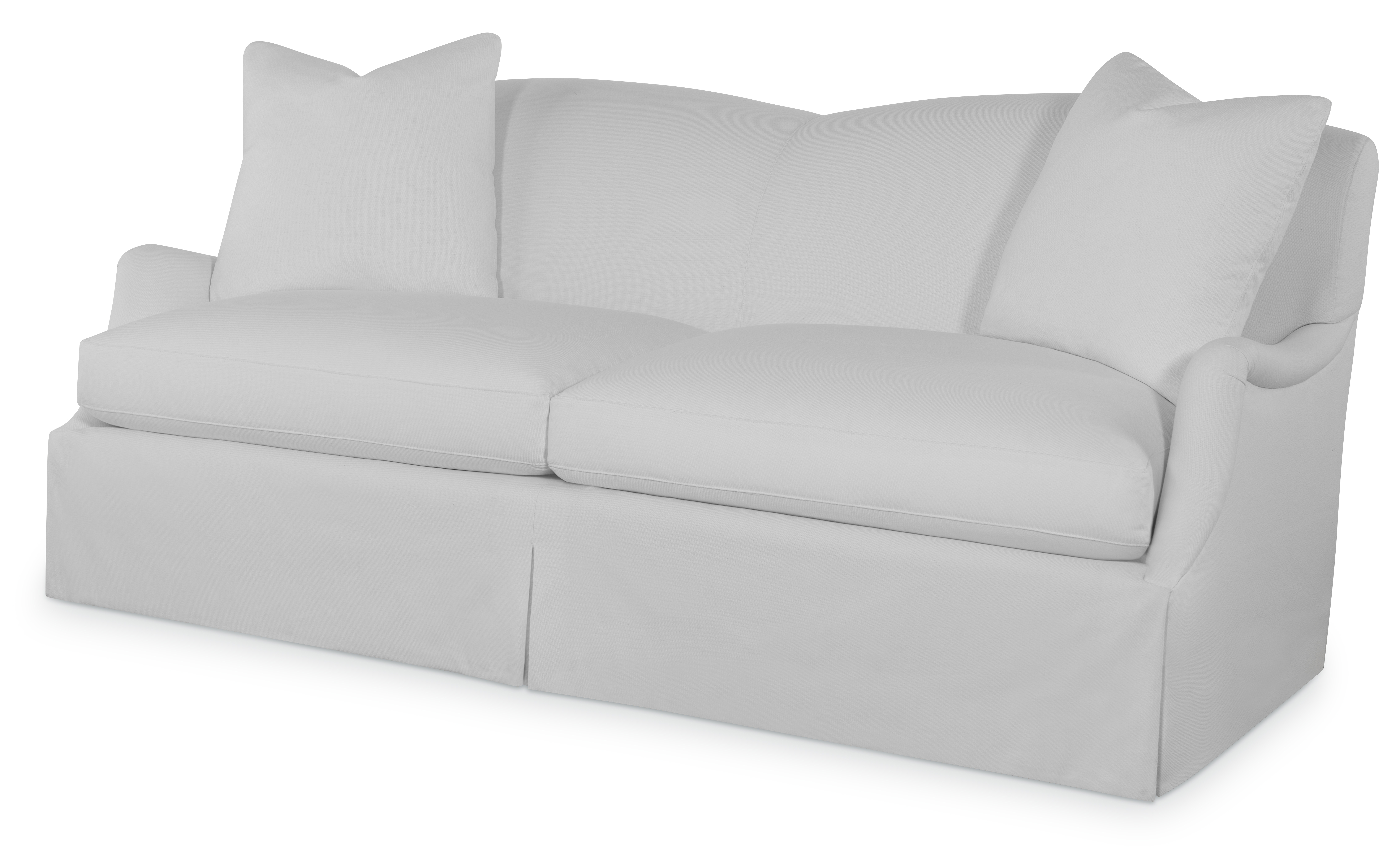 The silhouette of the frame was inspired by an English Antique. We modified the shape of the traditional English arm and added a graceful waterfall skirt to give the piece a more modern sensibility. Standard with Topstitch on Cushions and In-Back. No Welt.